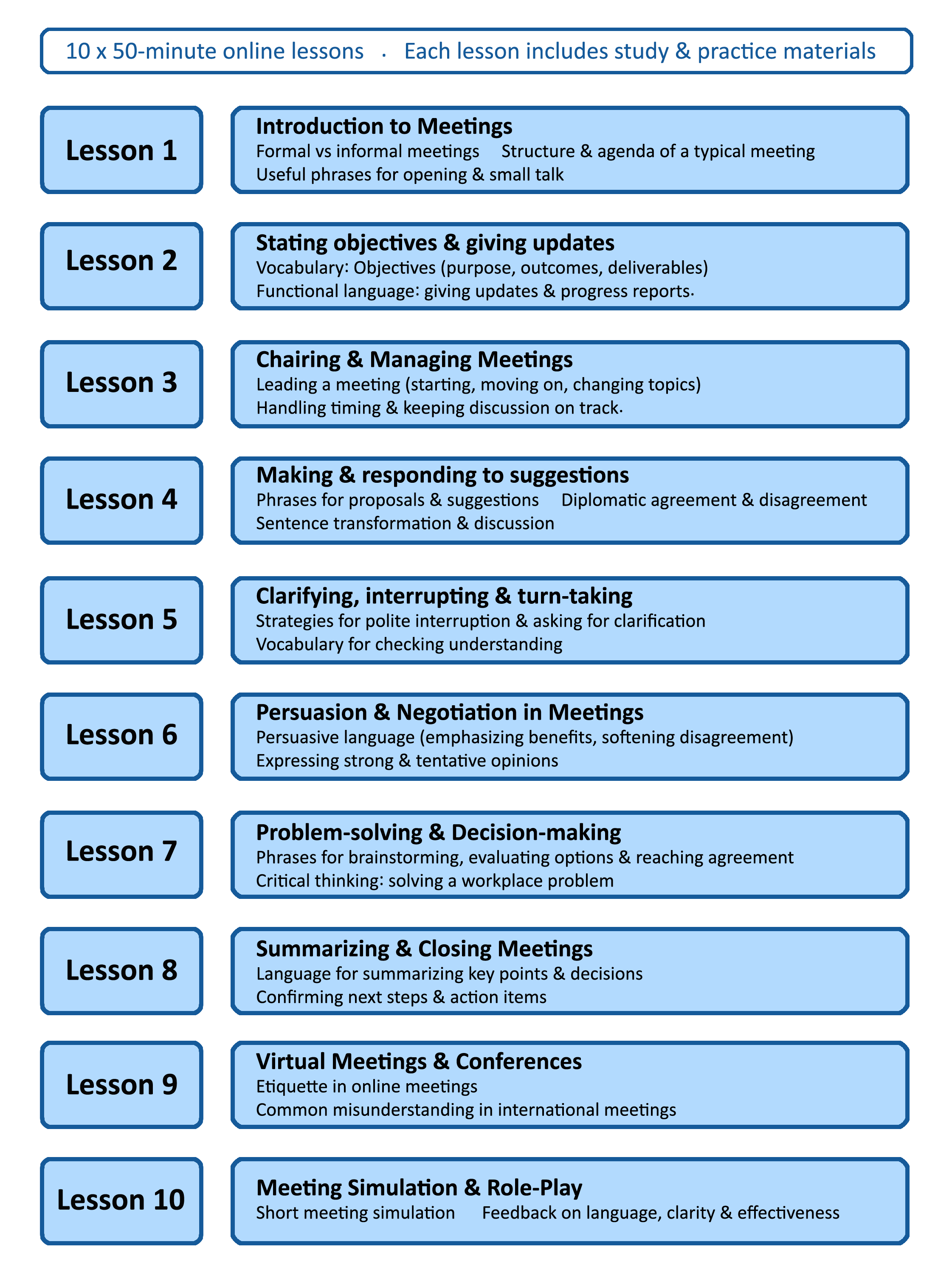 In today’s fast-paced, global workplace, meetings are where ideas are pitched, decisions are made, and careers move forward. The Business English Meetings Skills short course is a focused, high-impact 10-lesson program designed to help professionals communicate with confidence and clarity in English-medium meetings. Whether you are leading discussions, contributing ideas, or negotiating outcomes, this course equips you with the language and strategies you need to perform at your best.