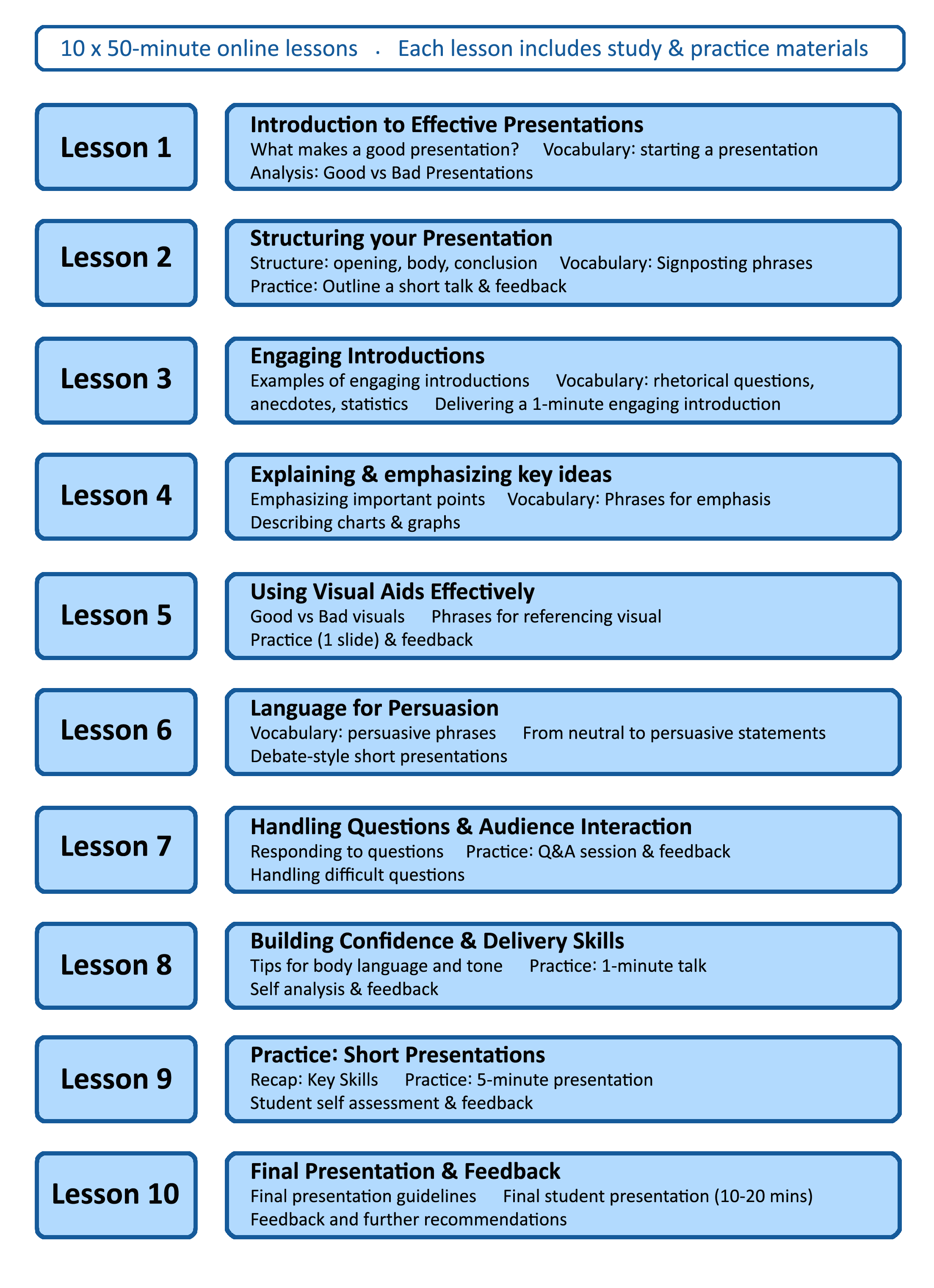 Our 10-lesson Business English Presentation Skills course is a focused, practical program designed to help professionals deliver presentations with confidence, clarity and impact. This short course goes beyond general English and targets the real-world language, structure and delivery techniques used in modern business presentations.